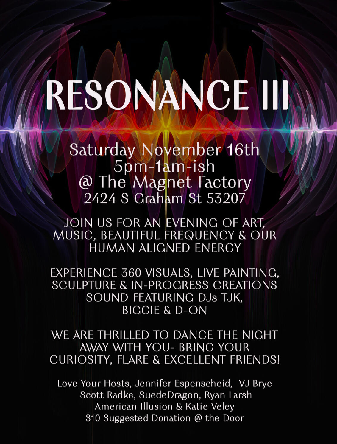Every Resonance will be an evolution of the last. In this CoCreation we combine Gallery Show, live performances and Dance Party in a graceful arc from sunset till late.When we are all in the same frequency- aligned by art, light, scent, music, laughter, & amazing human energy- we are in resonance. Our vibrations all in coherence. In this Chrysalis wonderful understanding, creativity, exploration & enlightenment are achieved ... we are in a unified flow state where everything is possible.Please add your curiosity & purposeful vibration! Our hope is that you meet someone new, have provocative conversation, delight in the work, move to the sound waves & leave with extra juice and bigger smiles. We have so much we want to share!FAMILY FRIENDLY! The music will turn up around 9 ;)Tonight you will experience a Gallery Show & Party stirred together to better tickle your senses...